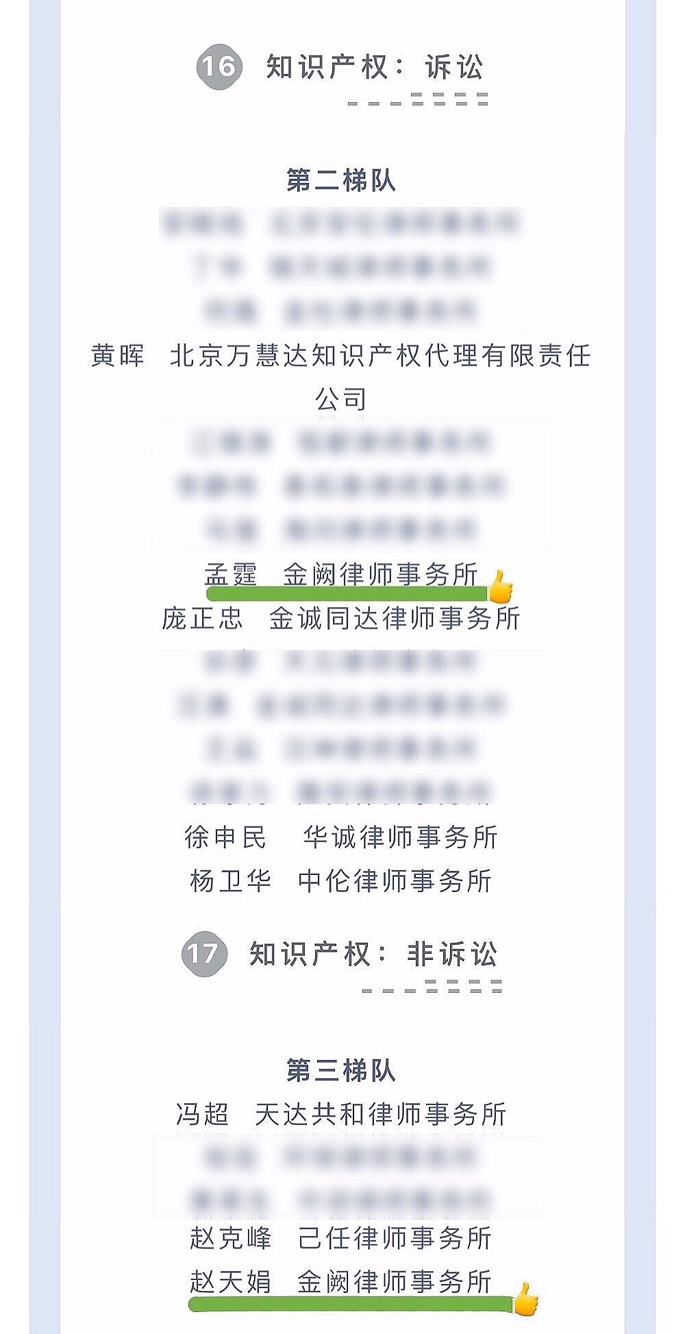 金阙合伙人孟霆律师和赵天娟律师分别在知识产权诉讼和非诉讼领域获得认可。两位律师都具备高水平的职业素养,业务能力强,能为客户提供全面的专业服务。